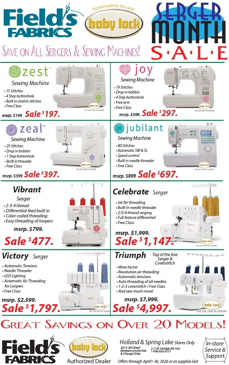 Field's Fabrics Baby Lock - Serger Month Sale March 31, 2026Field's Fabrics Available at our Holland and Spring Lake Stores OnlyPlease call Holland at 616-392-4806 or Spring Lake 616-846-6040